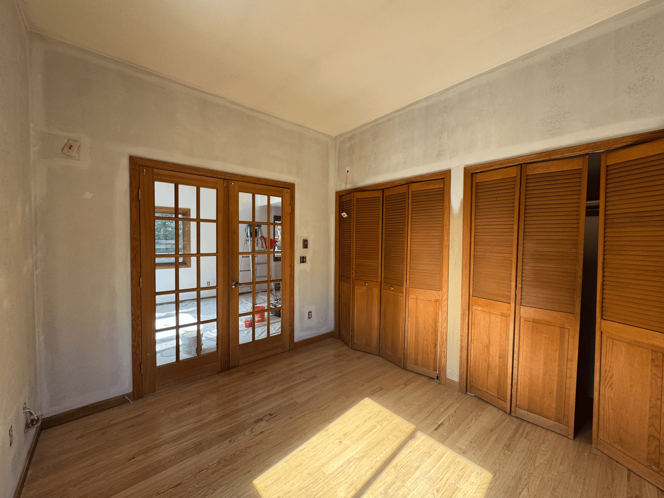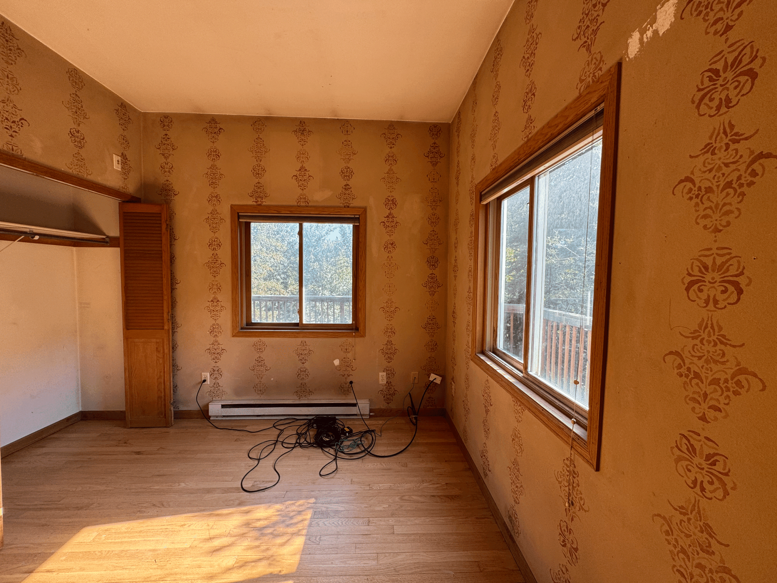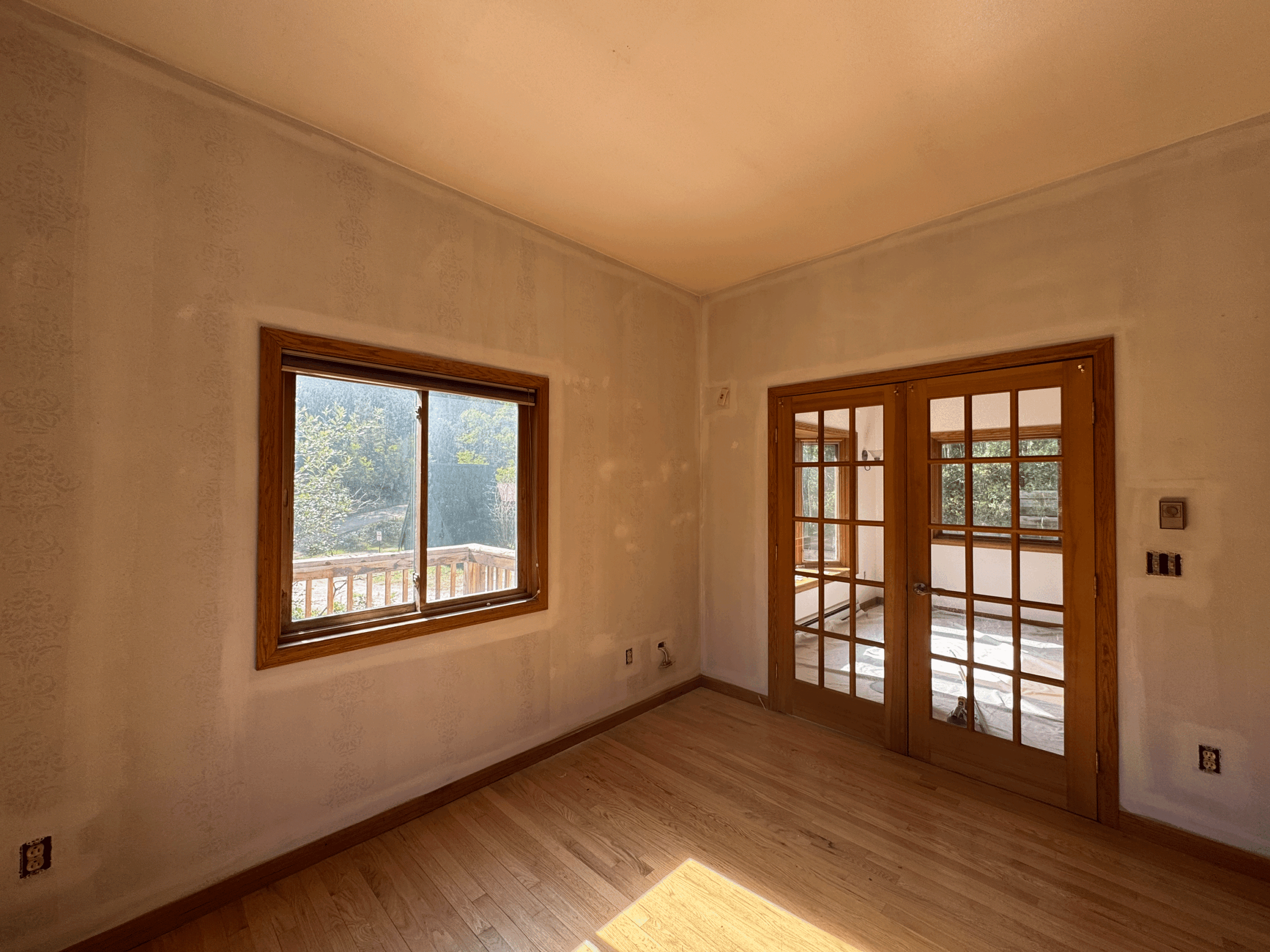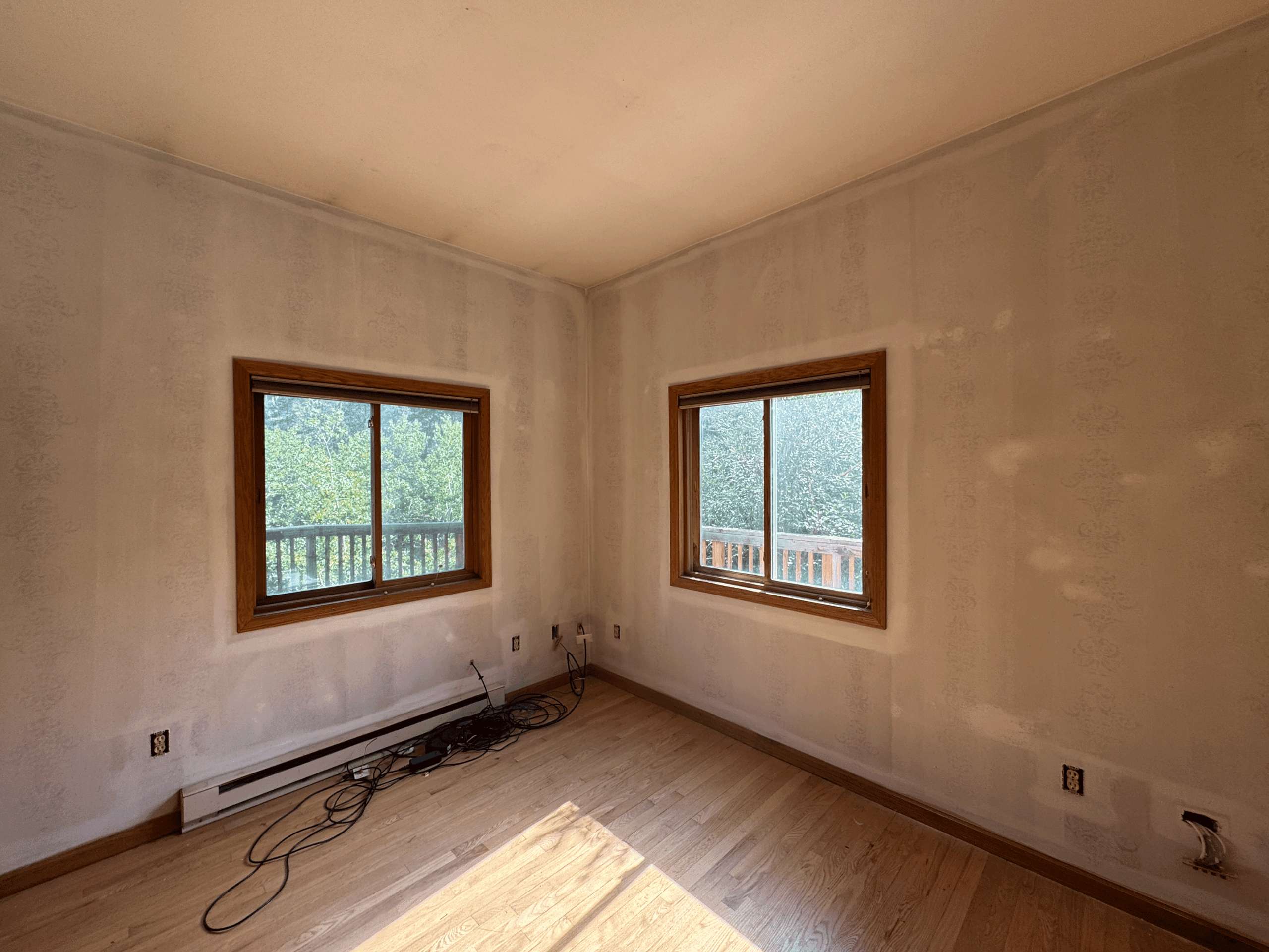 This was one room out of a full interior I did August 2025. It had a previously stenciled dark pattern that needed to be sanded and primed before painting. All pin holes and larger were filled, walls & ceiling primed (walls twice) and got two coats of Sherwin Williams Cashmere. These photos were taken at the end of the day after sweeping and cleaning up. Floor protection used during all steps.